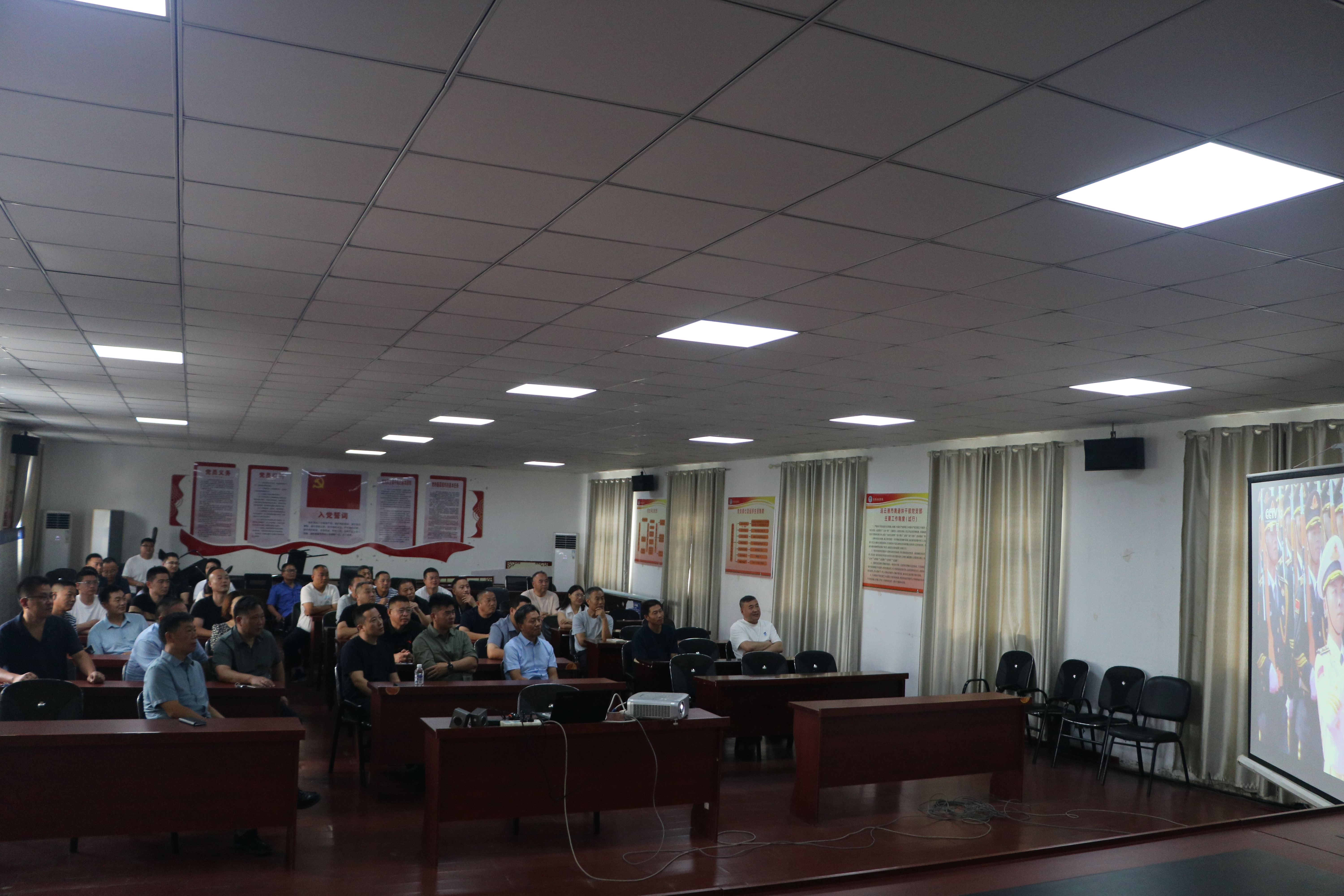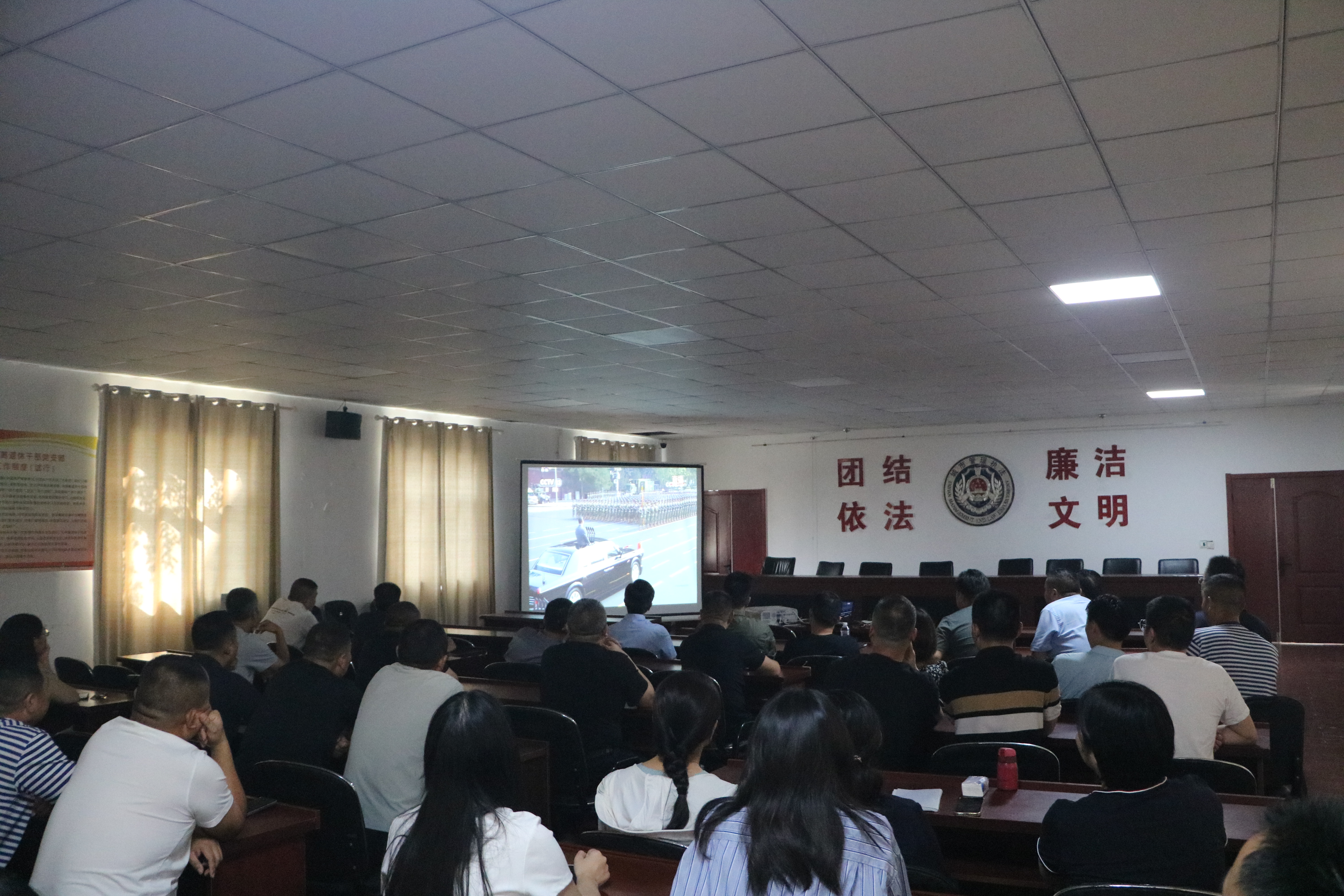 9月3日上午8點(diǎn)半,東海縣城管局黨組按照縣委組織部要求,組織領(lǐng)導(dǎo)班子成員及機(jī)關(guān)黨員干部職工來(lái)到會(huì)議室,個(gè)個(gè)精神抖擻,熱情飽滿,耐心等待閱兵式直播開(kāi)始。